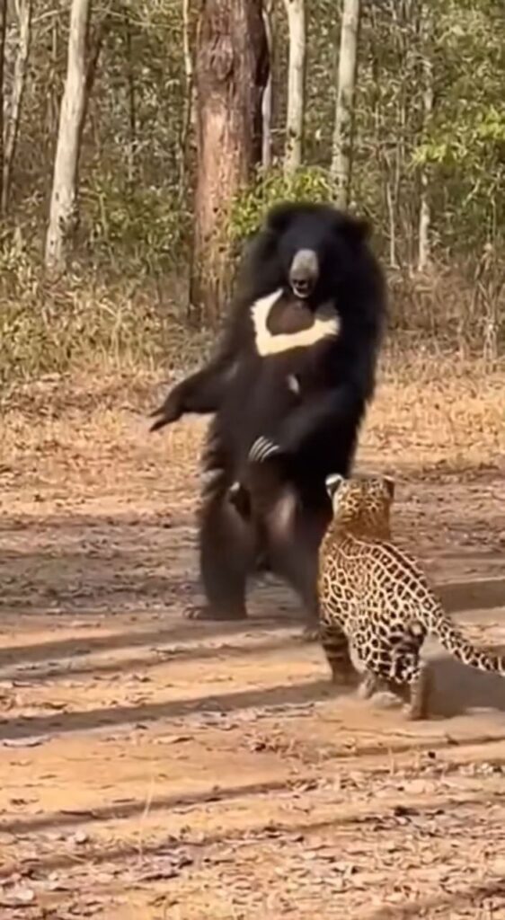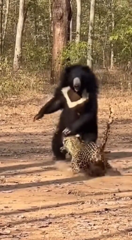 कुछ ही सेकंड बाद अचानक तेंदुआ बिजली जैसी फुर्ती के साथ भालू पर झपट पड़ता है। इसके बाद दोनों के बीच जोरदार संघर्ष शुरू हो जाता है। भालू अपने भारी शरीर और ताकत से जवाबी हमला करता है, जबकि तेंदुआ तेजी और पंजों-दांतों के वार से लगातार दबाव बनाता दिखता है। जंगल की जमीन पर लोटते-घूमते दोनों की यह जंग बेहद खतरनाक और असामान्य नजर आती है, क्योंकि आम तौर पर ऐसे मुकाबले बहुत कम देखने को मिलते हैं।